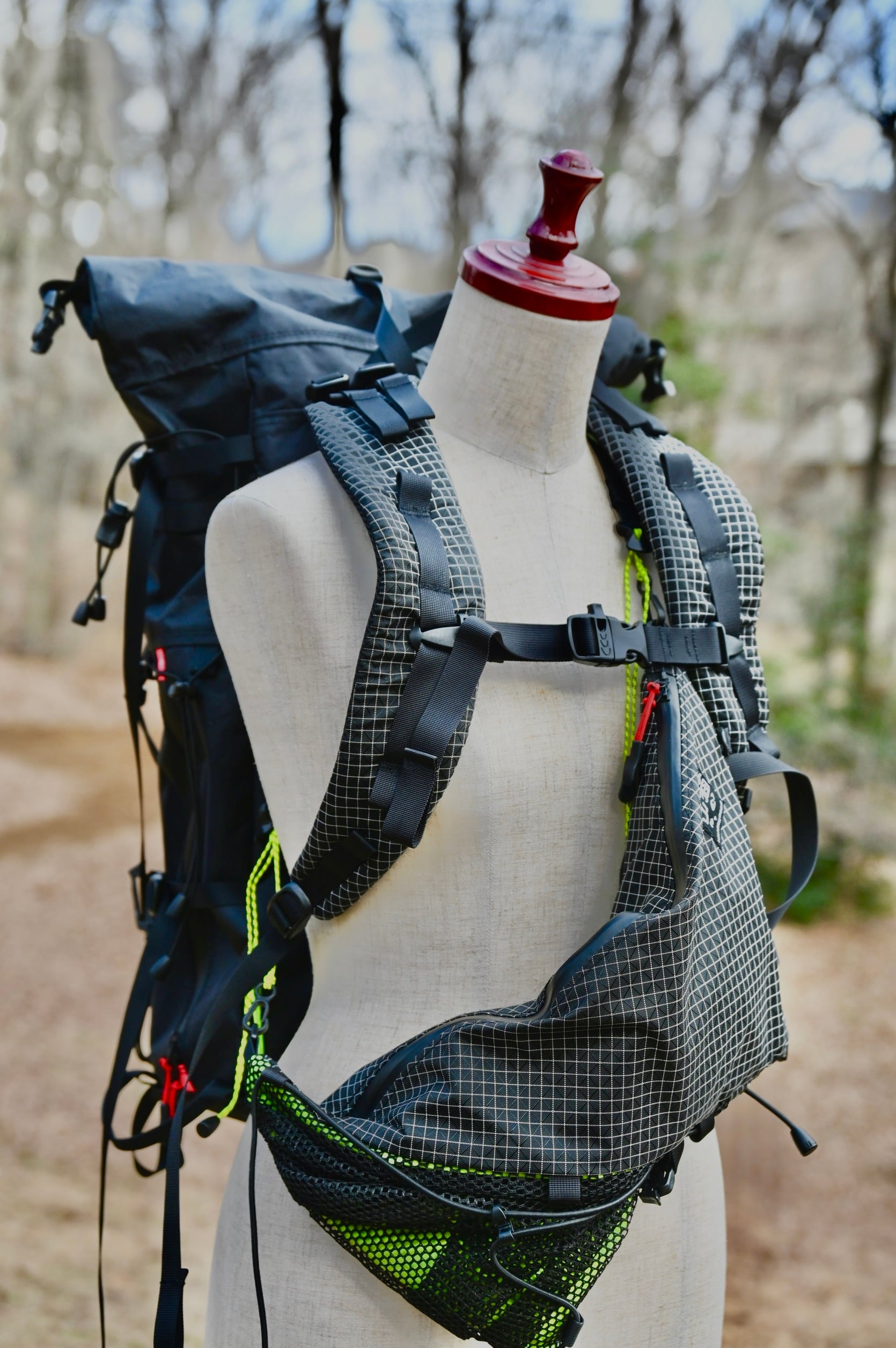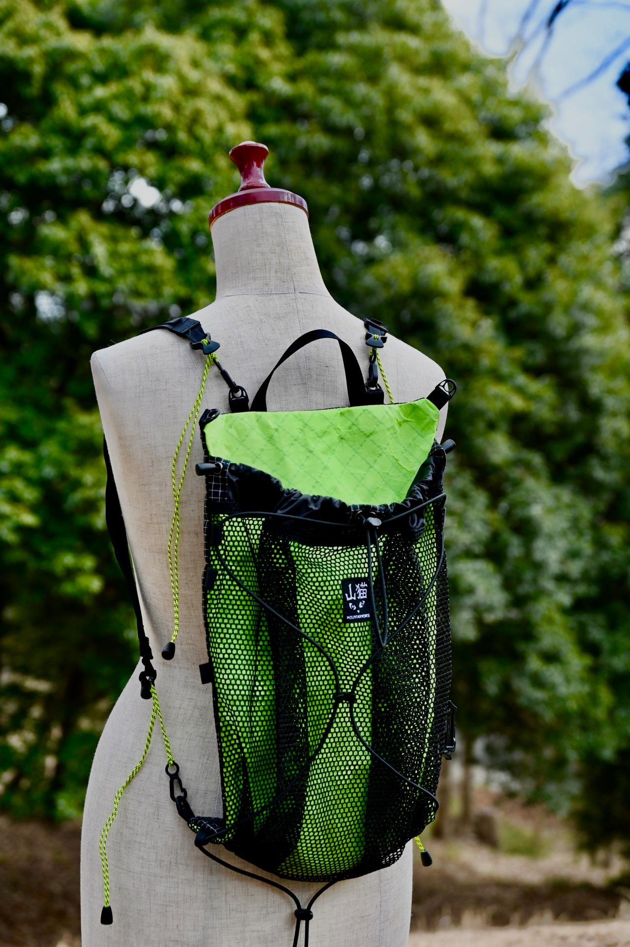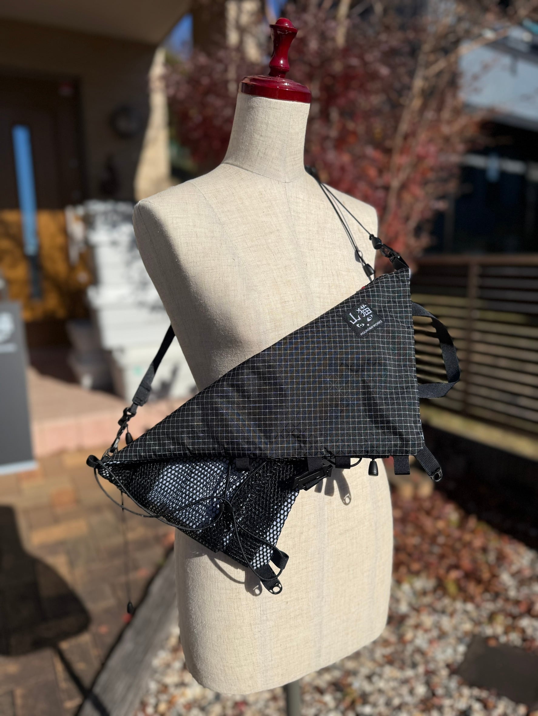 二つの三角形をメインポケットにするサコッシュ仕様、サコッシュを展開するとアタックザックになり、さらにショルダーベルトを外すと山猫O.D.Aに外付け出来る追加のメッシュポケットになります。用途にあわせてスタイルを変更出来る便利なアイテムになります。