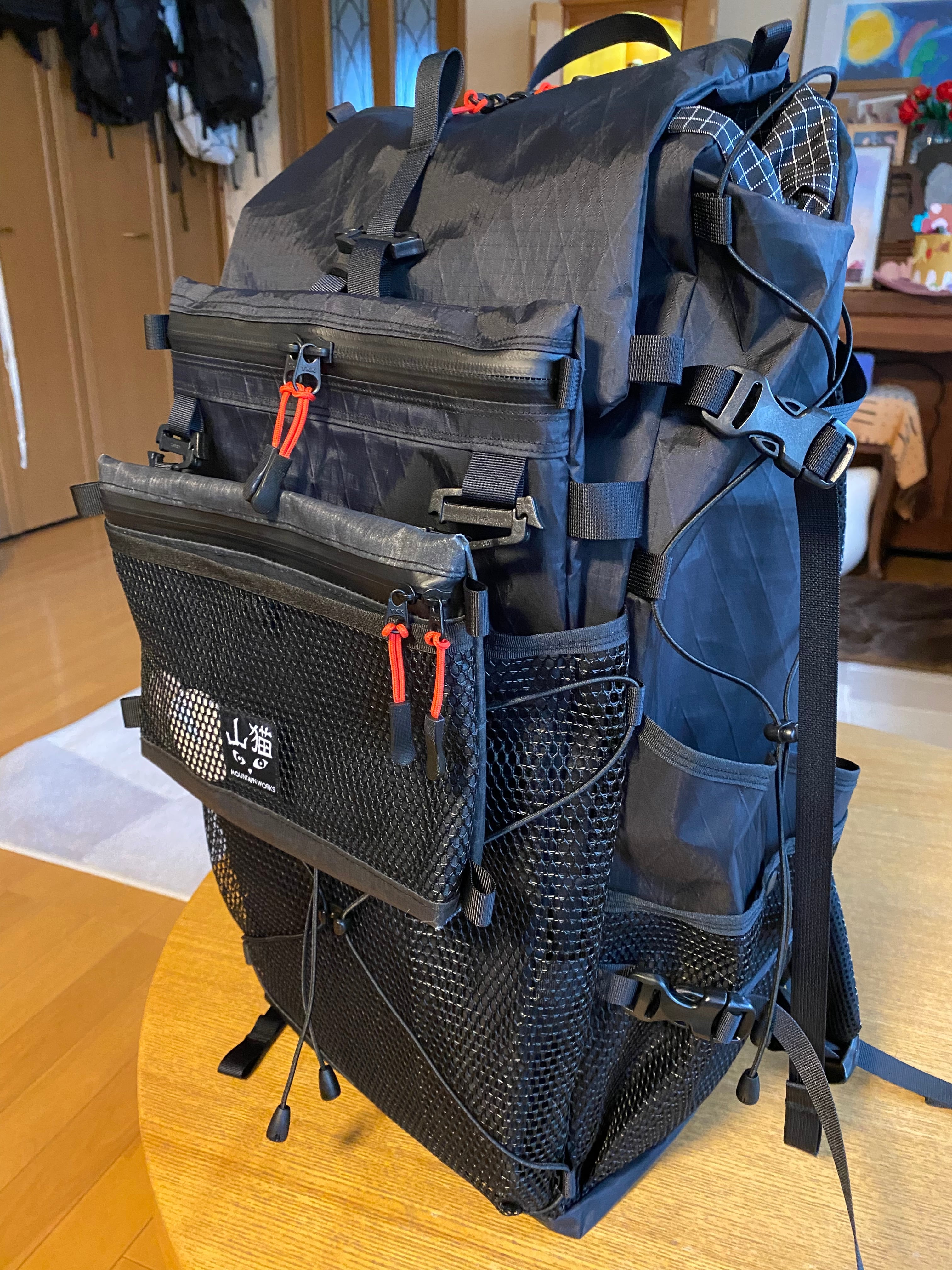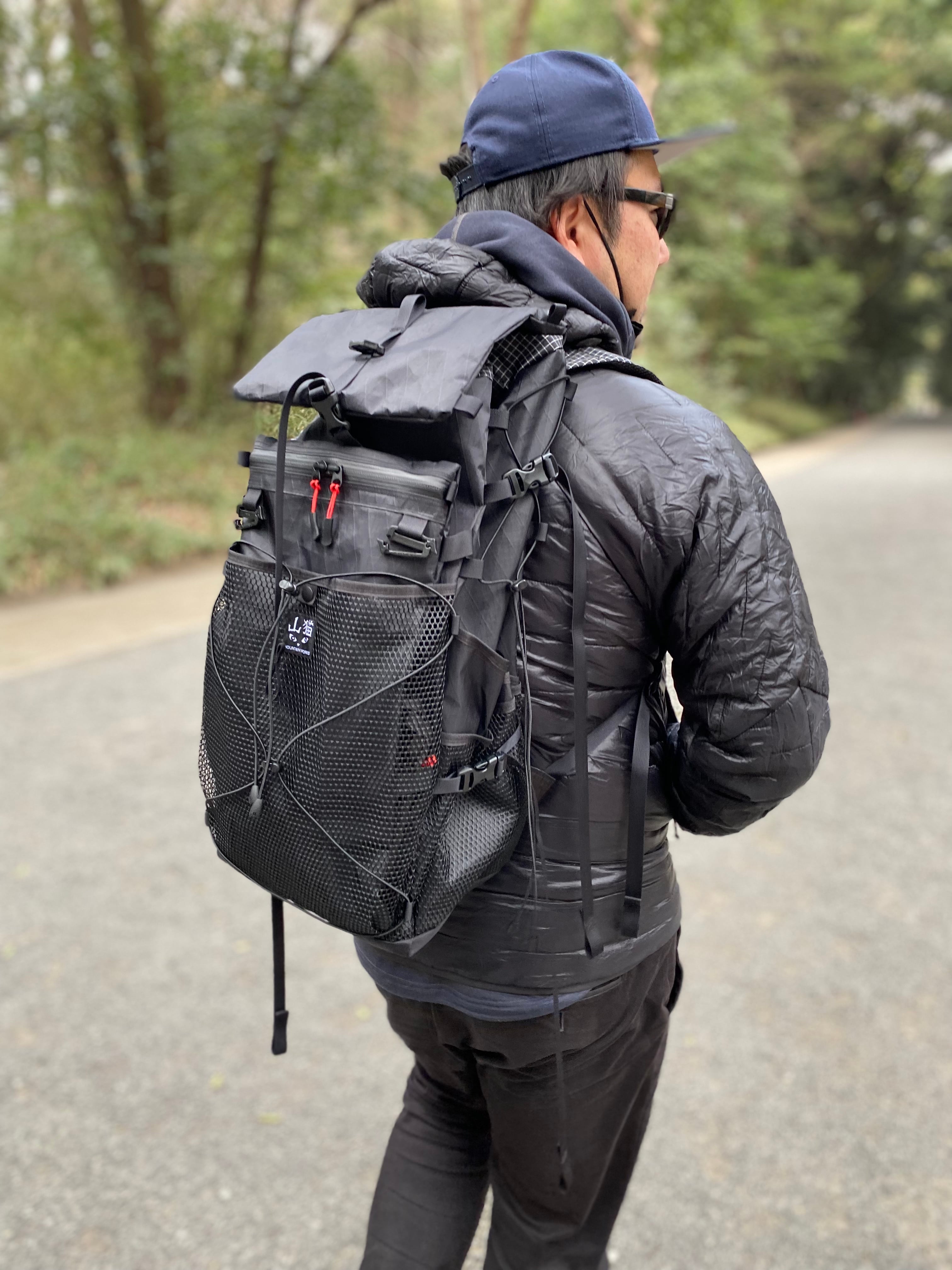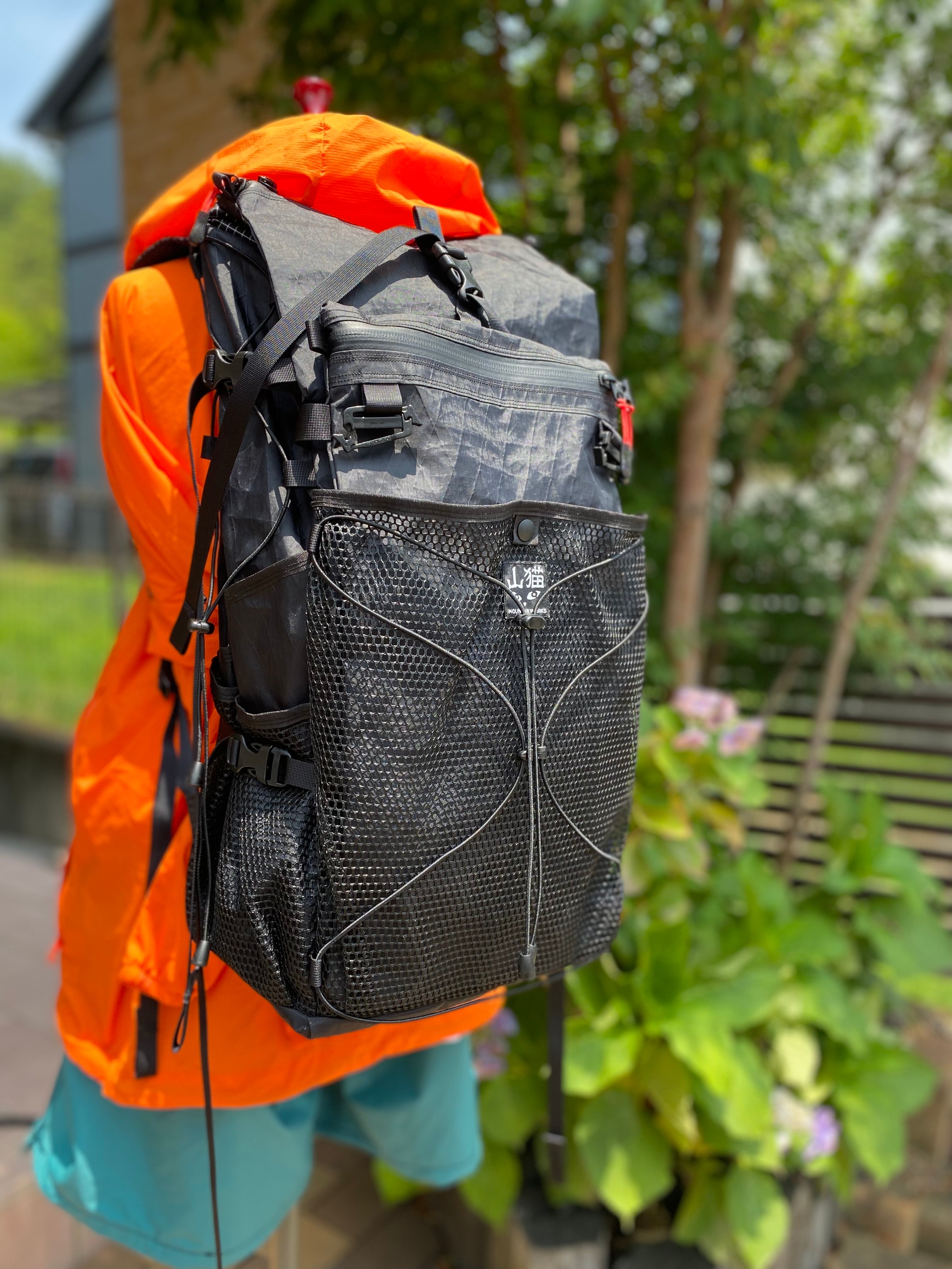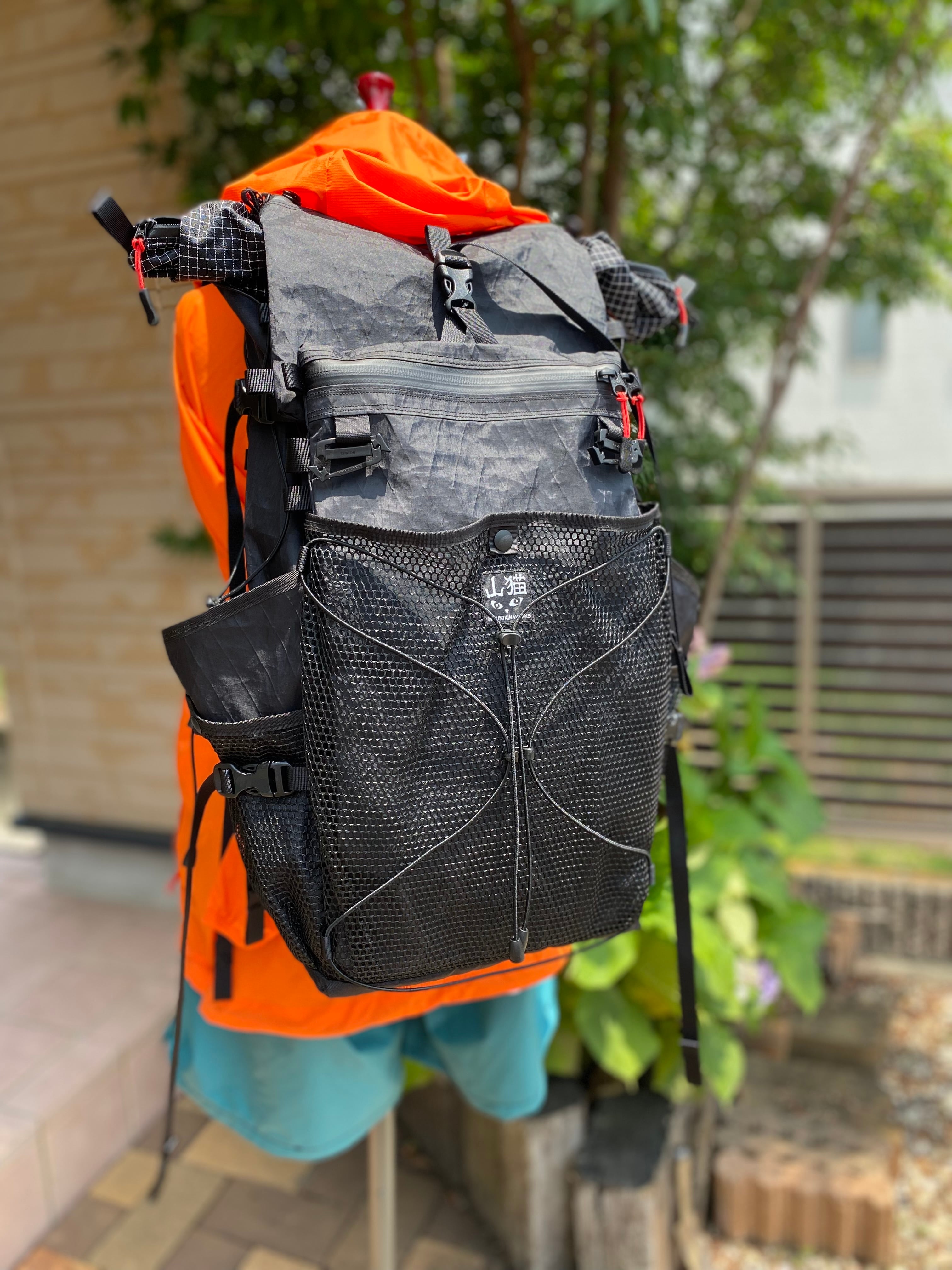 私は普段、1気質+左右ドリンクポケット、外側メインのポケット仕様のザックを使用することが多いですが、こちらは大型メッシュ、雨蓋イメージのフラップポケット、止水ジップ付きのポケット、更にそのポケットが壁になり入れたいものをポンポン出し入れできるフリーポケットを設置しました。