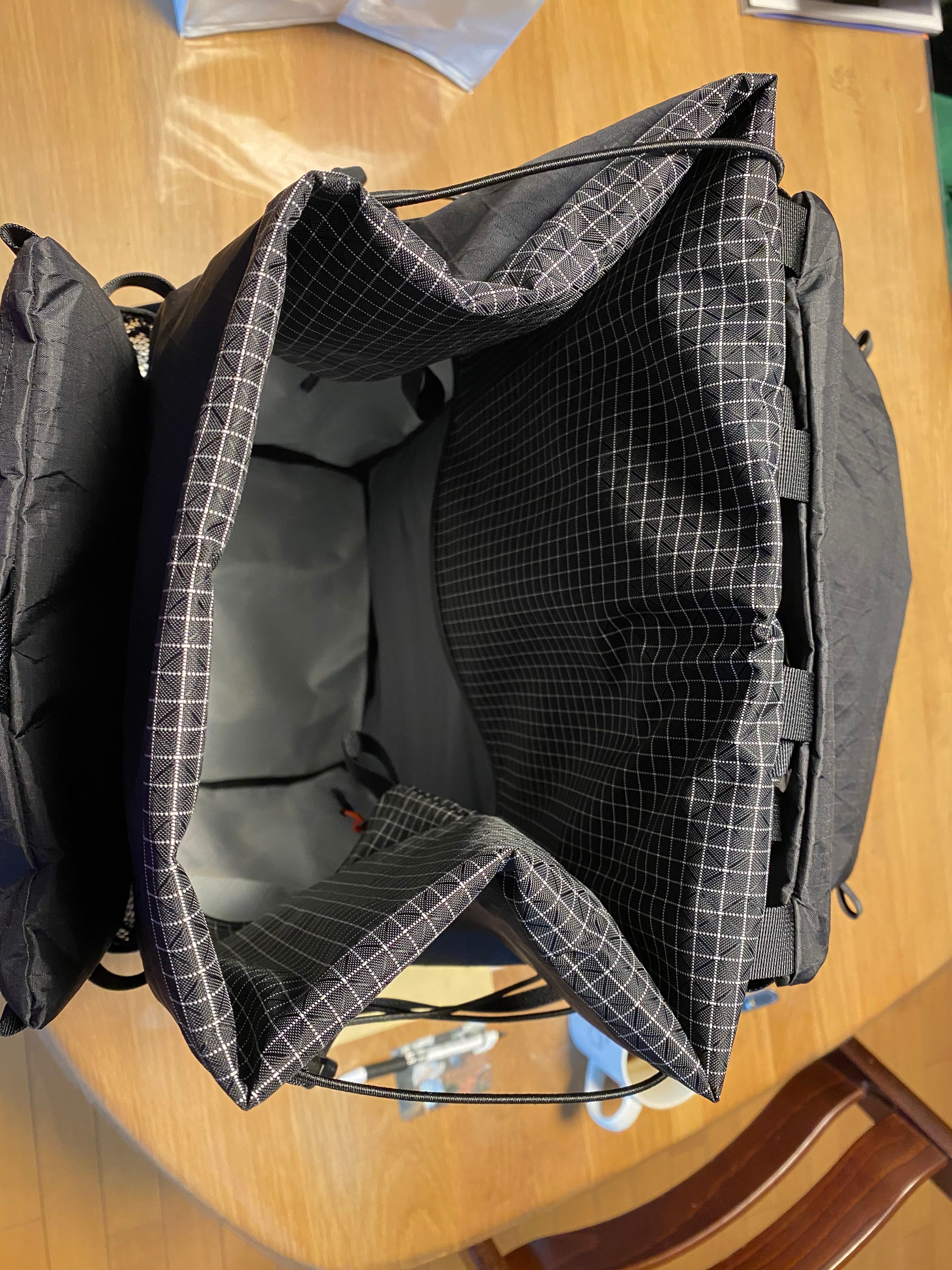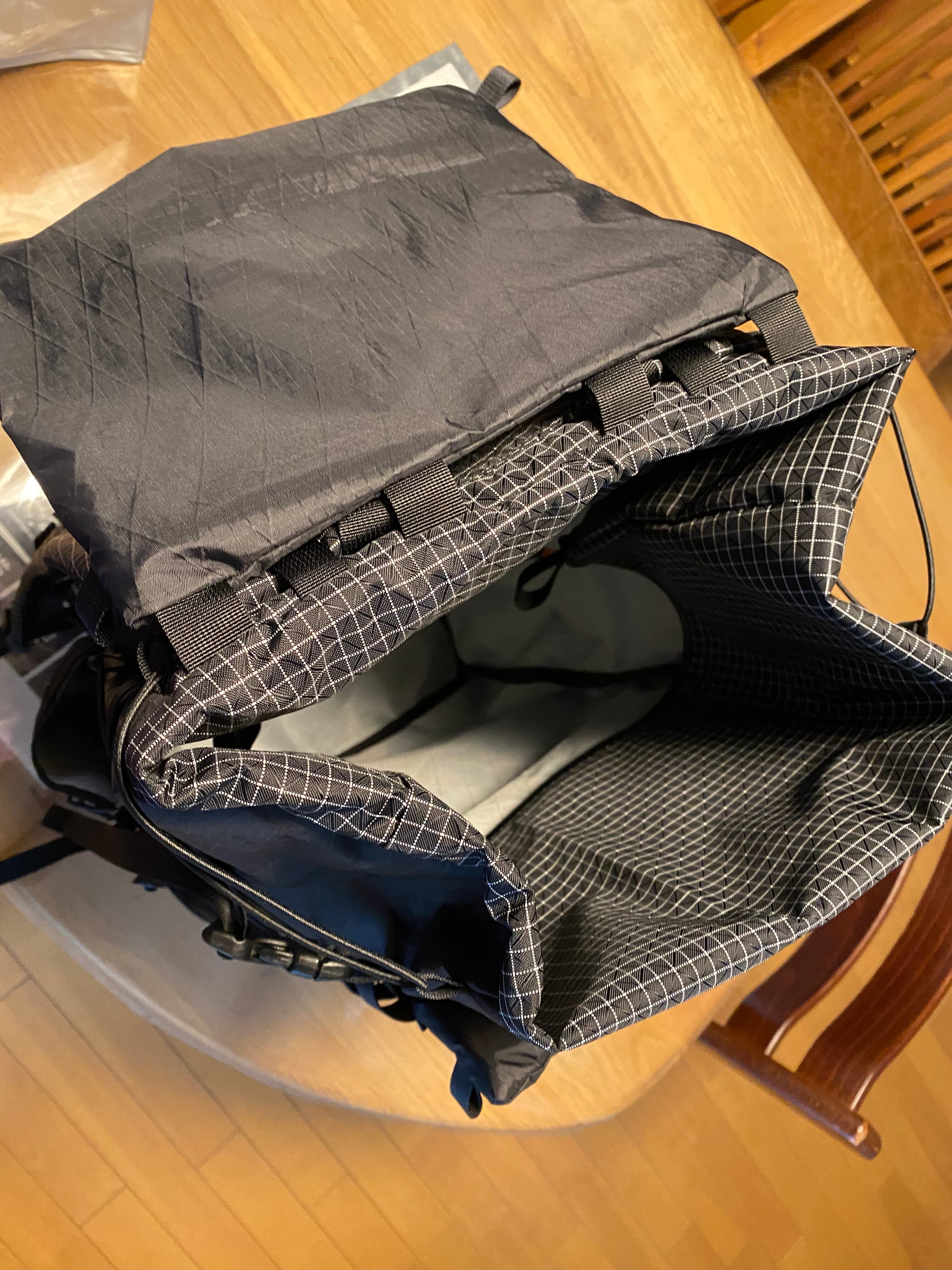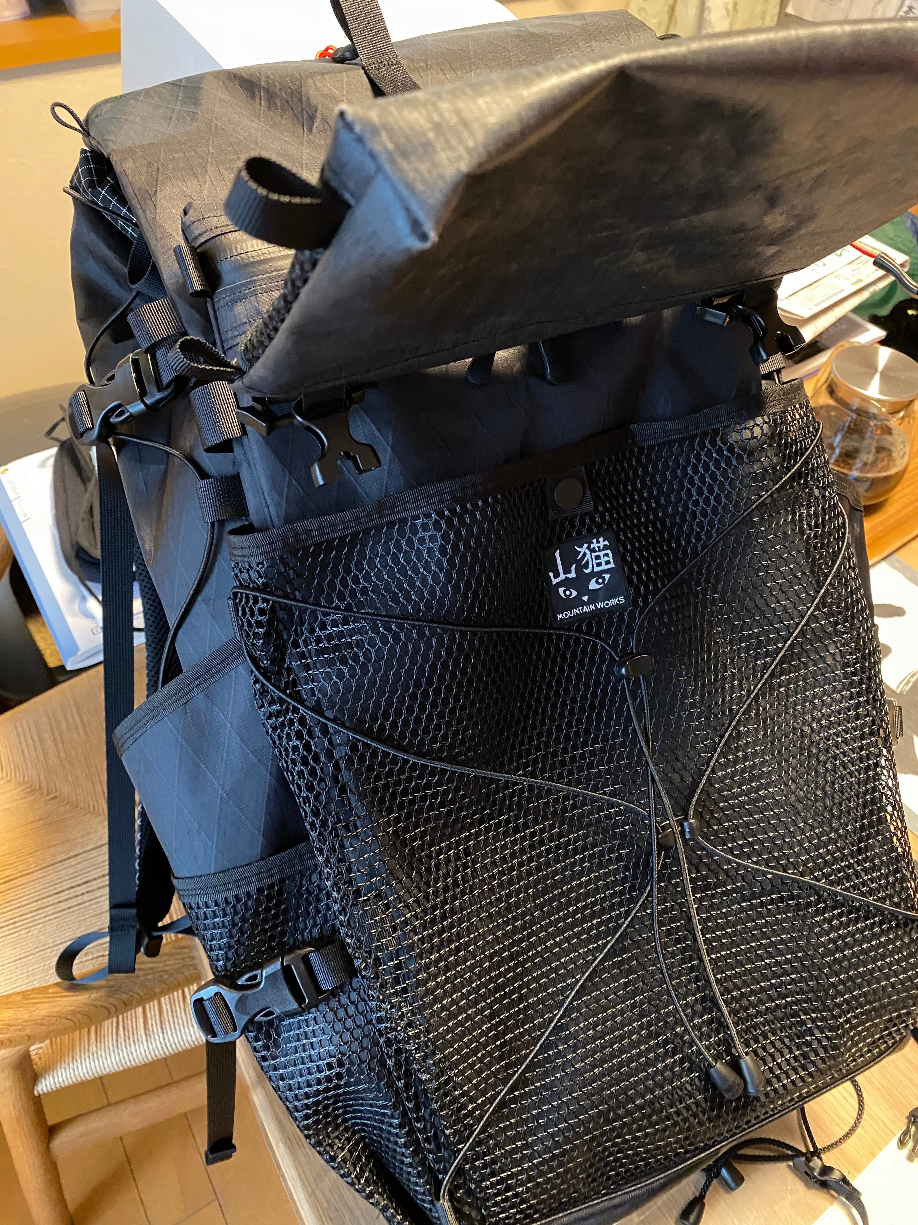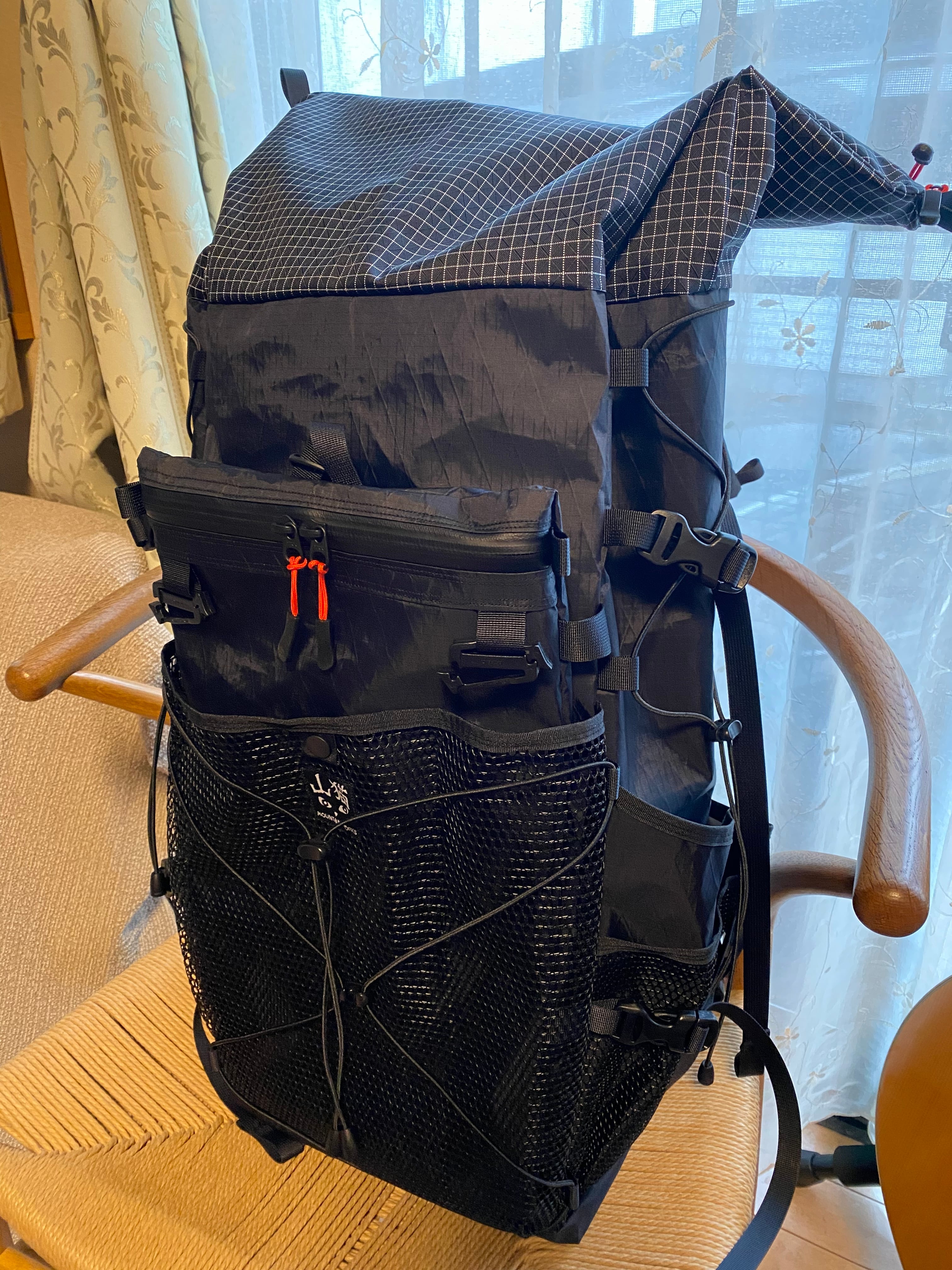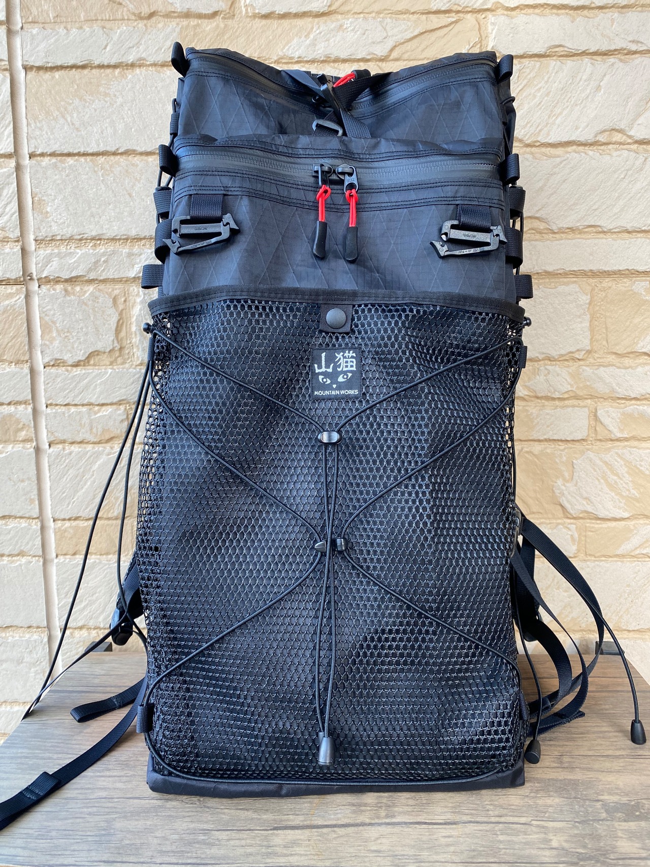 私は普段、1気質+左右ドリンクポケット、外側メインのポケット仕様のザックを使用することが多いですが、こちらは大型メッシュ、雨蓋イメージのフラップポケット、止水ジップ付きのポケット、更にそのポケットが壁になり入れたいものをポンポン出し入れできるフリーポケットを設置しました。