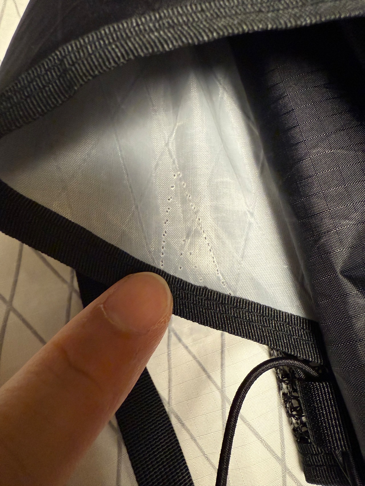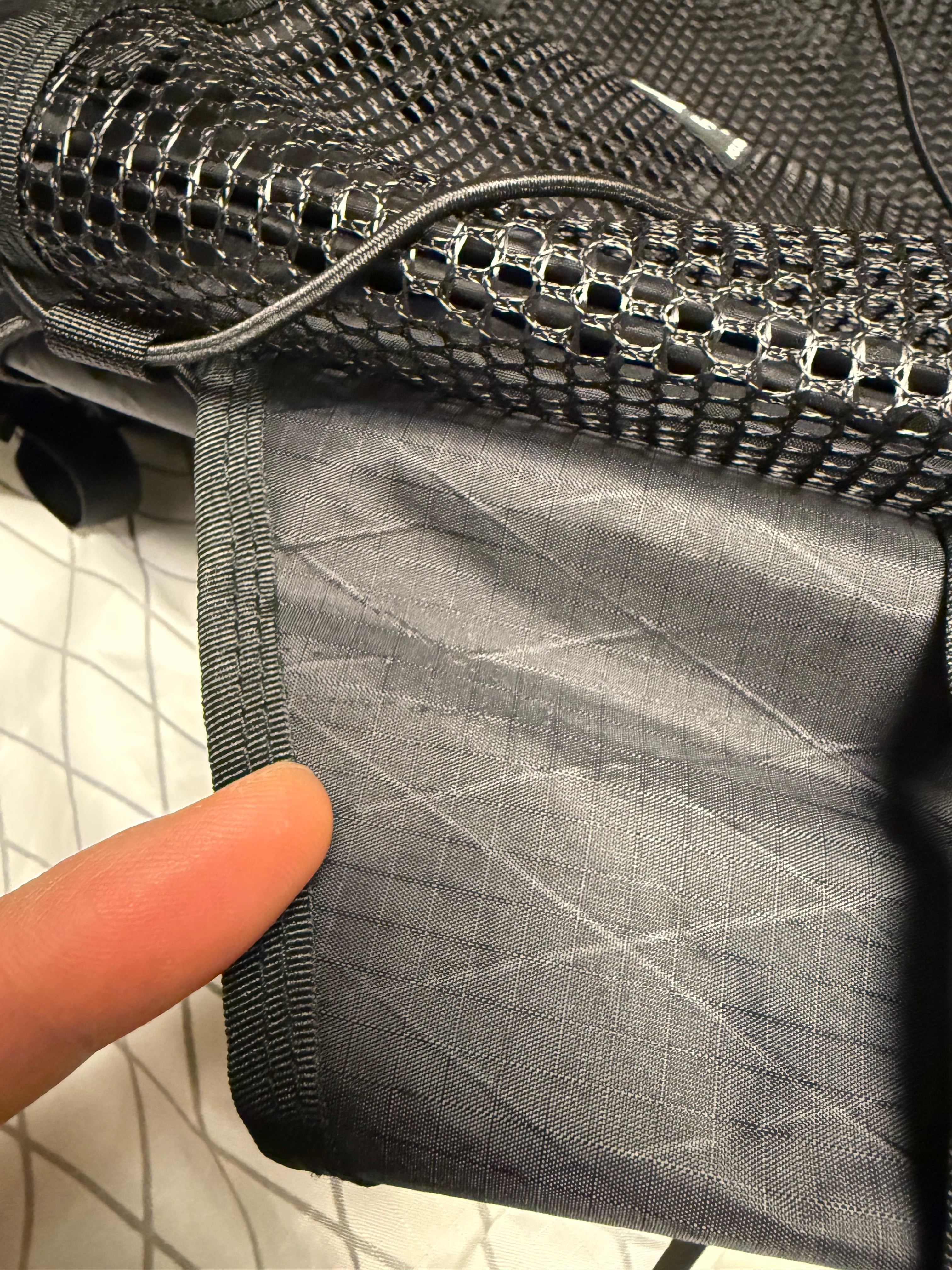 →バックパックの背負った際の左側のサイドポケット入り口付近に誤って縫製をした『ステッチ穴』があります。画像にてご確認ください。